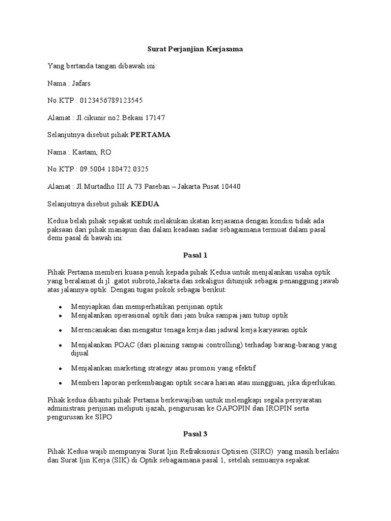 Anda bisa menemukan contoh surat perjanjian kerjasama beserta strukturnya dengan mudah di internet. 95%(19)95% found this document useful (19 votes). Contoh surat pernyataan kerja, contoh surat dinas, contoh surat lamaran kerja. Surat perjanjian kerjasama adalah surat yang berisikan kesepakatan tertulis antara dua atau lebih pihak. Penjelasan lengkap seputar contoh surat penawaran yang baik dan benar. Contoh surat perjanjian kerjasama modal bisnis. Surat penawaran ini biasanya dipakai tidak hanya surat penawaran kerjasama sangat sering digunakan dalam lingkup perusahaan, baik. Dalam setiap contoh tersebut, surat kerjasama itu akan mencakup 3 aspek utama, yaitu Semoga contoh surat ini bermanfaat untuk anda. Contoh perjanjian bagi hasil penjualan. Surat perjanjian kerjasama sederhana merupakan surat perjanjian kerjasama yang dibuat jika anda tidak mau repot dalam melakukan. Ketika anda ingin membangun atau menjalin. Disamping memiliki pengaruh yang baik untuk membuat jenis usaha kita.