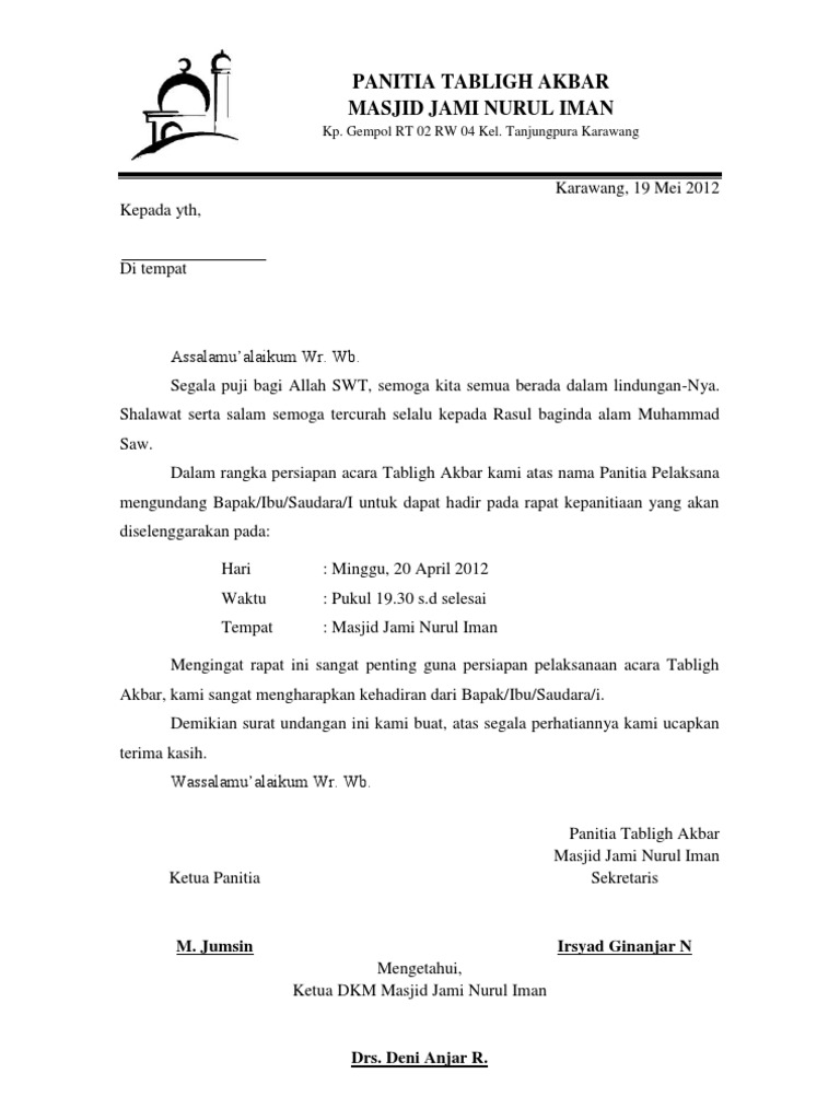 Contoh Surat Undangan Rapat Masjid / Undangan Rapat Panitia Mesjid : Demikian surat pemberitahuan dan undangan ini kami sampaikan kepada seluruh jma'ah masjid wilayah sukosari.. Smp negeri 7 kebumen alamat : Kop surat dibutuhkan untuk menjelaskan siapakah pembuat surat tersebut. Bapak/ibu peserta kumpulan korban sapi. Contoh undangan rapat pengurus masjid (remaja masjid). Pengertian surat undangan tidak resmi.